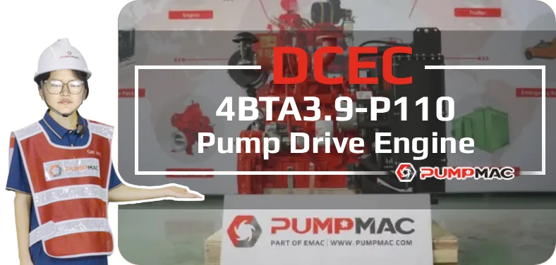 DCEC 4BTA3.9-P110 pump drive engine is a 4-cylinders in line, 3.9 liters four-strokes engine with 102 mm bore and 120 mm stroke. Equipped with mechanical fuel pump and electronic governor, comes with turbocharger and Water-Air intercooler.