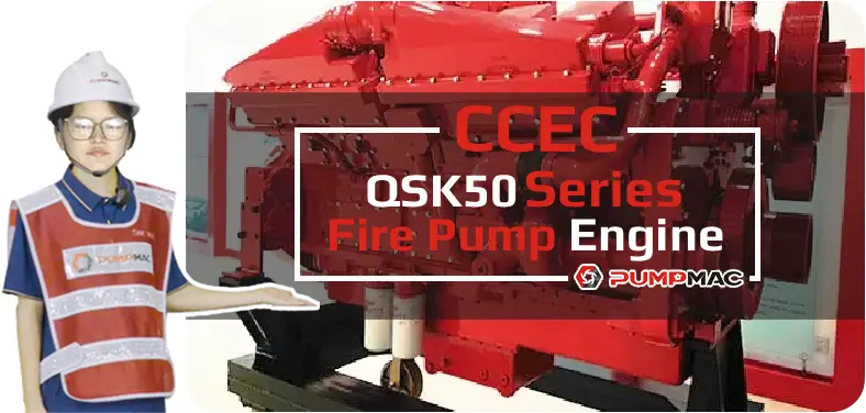 CCEC QSK50 series Fire Pump Engine is V type 16-cylinder, 50.3 liters four-strokes engine with 159 mm (6.25 in) bore and 159 mm (6.25 in) stroke. CCEC QSK50 series Fire Pump Engine equipped with PT Fuel System and Air-Air intercooler, comes with turbocharger. The prime power range of CCEC QSK50 series Fire Pump Engine is from 1400 HP to 2500 HP (1044 kW to 1864 kW). The torque range of the QSK50 Series Fire Pump Engine is 6379 N.m to 9601 N.m.