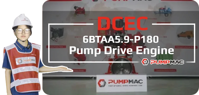 DCEC 6BTAA5.9-P180 pump drive engine is a 6-cylinders in line, 5.9 liters four-strokes engine with 102 mm bore and 120 mm stroke. Equipped with mechanical fuel pump and electronic governor, comes with turbocharger and Air-Air intercooler.